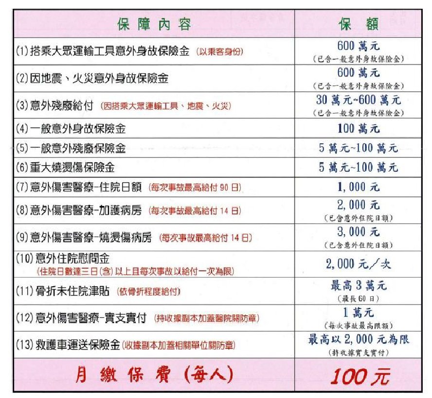 ③ 其他: 團保(意外險) – 若投保”團保(意外險)” 需預收300元,保障內容請參考下方。